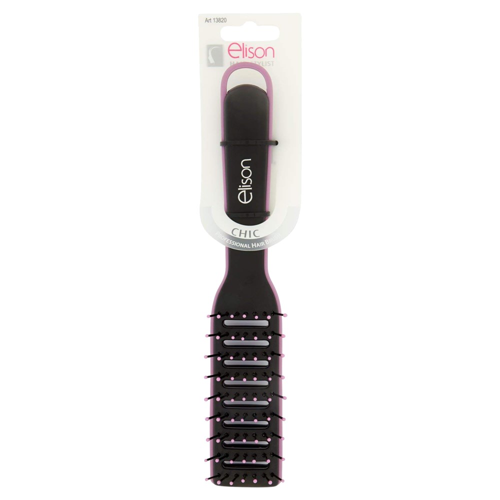 Hair brush, made of polypropylene material, with polyacetal plastic material spokes, which do not cause friction, do not damage the scalp and do not break the hair. It can be used for combing the hair, for hair styling and for massaging the scalp, while stimulating blood circulation and healthy hair growth. It is recommended to keep away from high temperatures, water and chemicals. This product is suitable for professional and non-professional use.