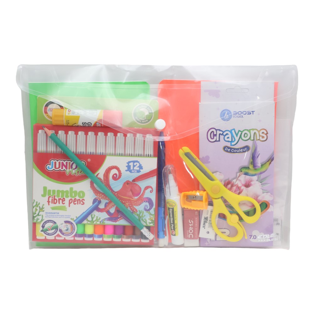 The promotional school set for children contains various school tools, designed to support daily activities at school. This set provides everything a child needs to start the school year, including pencils, crayons, and other necessary accessories.