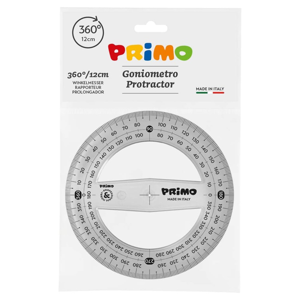 The Primo Protractor, 360°, 12 cm, is an indispensable tool for precise measurements and drawing. With an attractive and functional design, it can be rotated 360° to enable measurements in any direction, making it very easy to use for precise drawings and calculations. Made of durable and transparent plastic, it offers a clear view of the divisions and enables quick and precise measurements.