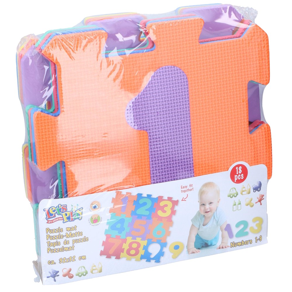 Puzzle mat, with 9 puzzle pieces, made of rubber material, in assorted colors, with rubber numbers design. The mat can be used as a protective layer in children’s bedrooms, to protect from moisture, it can be placed on side walls to protect children from injury during play and it can be adapted to all sizes of surfaces, thanks to the puzzle design. The constituent material and the paint have no toxic or harmful composition for children and the product is certified for children's safety. This product is suitable for use by children over 3 years old.