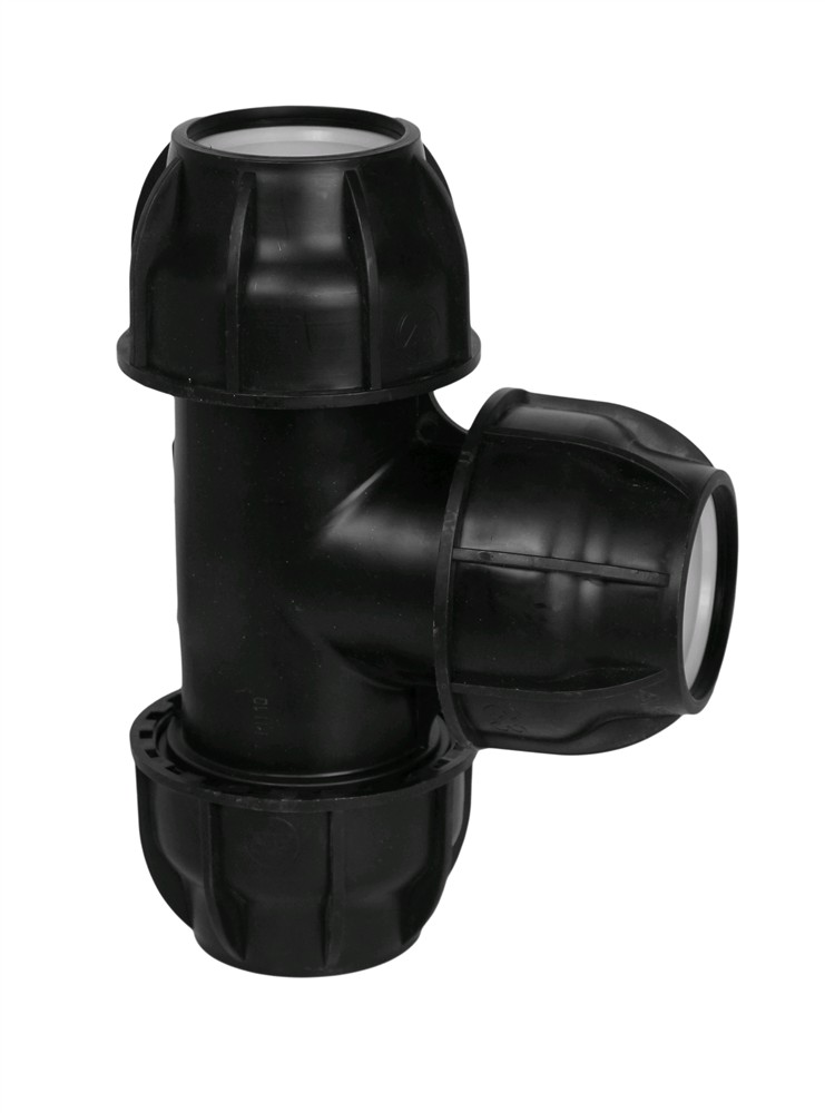 Tee with faucet of PP 63x63x63 mm with angle 90°. Used to installations angular water supply infrastructure lines, in irrigation and agricul, etc. The tee enables network branching 90° angle. The tee network connects three pipes through coercive mechanical faucet. Manufactured with European standards, resistant to corrosive materials designed to withstand pressure up to 10 Bar.