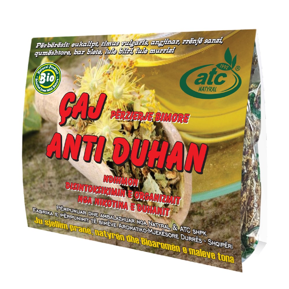 Anti-smoking tea, with a blend of medicinal herbs, which helps to relieve and cure specific symptoms of smoking cessation crisis such as metabolic, digestive disorders, etc. This mixture contains medicinal plants, which represent three different groups of active principles and include lemon balm, hawthorn, dandelion, yellow Gentian, artichoke, thymus, eucalyptus and linden. Lemon balm and hawthorn give sensitive effect against anxiety and are strong stimulants of the organism. Dandelion, yellow gentian and garden artichoke are consisted of active agents which protect the liver and kidneys, because they incline the cholesterol and increase the bile's secretion which make good solvent and diuretic. Thyme, eucalyptus leaves and linden are in the third group and have got balsamic and salivary role.
