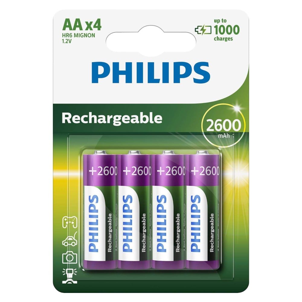 Ideal for all your digital applications. These high-capacity AA batteries do not need to be completely discharged before recharging. You can recharge the batteries whenever you want. In addition, these batteries can be recharged up to a thousand times. 2600 mAh rechargeable AA The 2600 mAh of energy keeps your toys and other general devices running for longer. Nickel Metal Hydride With Nickel Metal Hydride technology, batteries can be recharged multiple times, making replacement virtually unnecessary. No loss of capacity after use A nickel metal hydride battery can be recharged up to 1000 times without being completely discharged.