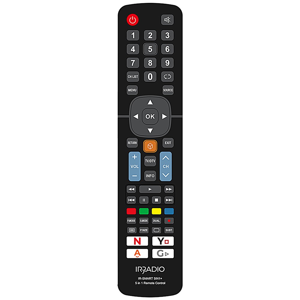 Ready to use 5 in 1 replacement remote control for TV, Mod. IR-SMART 5IN1+ Universal 5 in 1 infrared remote control compatible with TVs: SAMSUNG/LG/PHILIPS/SONY/PANASONIC. It includes all the functions of the original remote control, from the most common to the "smart" ones. It does not require any programming, simply insert the batteries and the remote control is ready for use. Technical specifications: • Black colour • Ready for use • Power supply: 2x 1.5 V – AAA/LR03 (not included) • Package contents: remote control, instructions • Dimensions (H x W x D): 215 x 48 x 17 mm