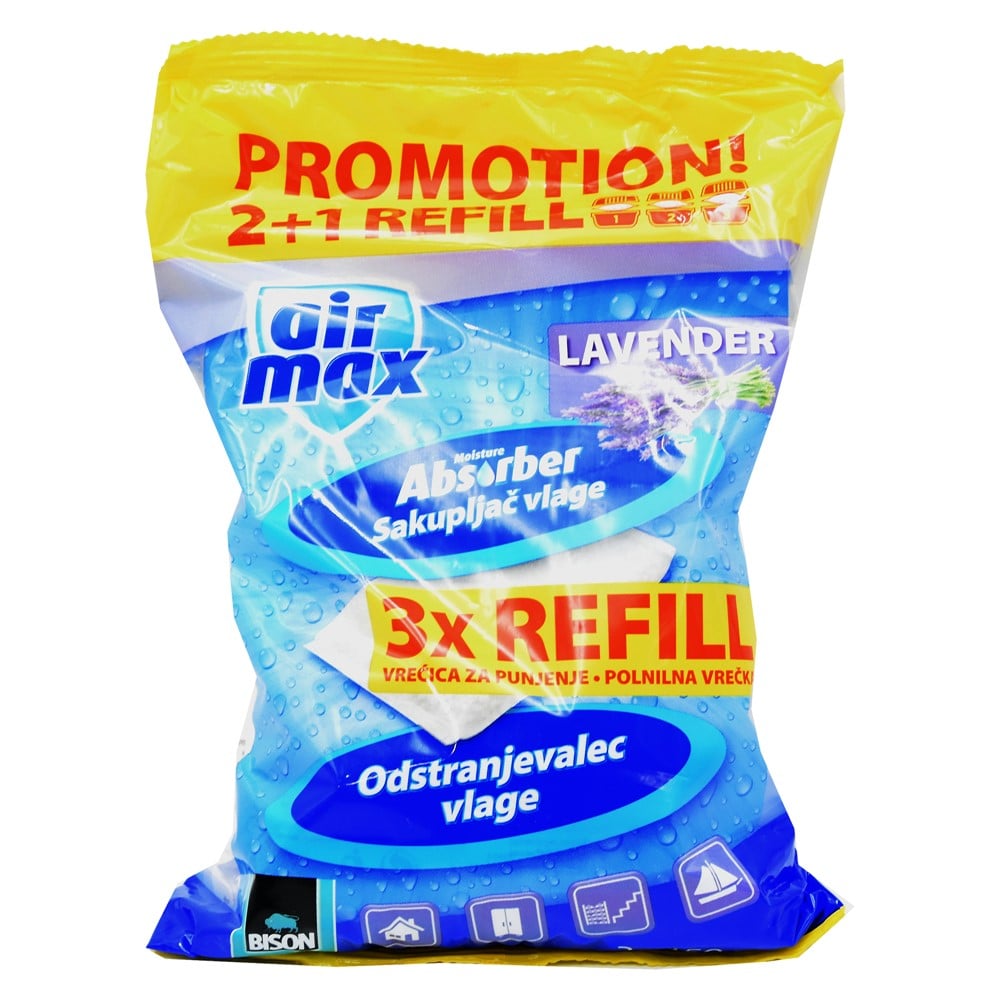 Practical filling bag for Air Max moisture absorber. Reduces high air humidity in closed rooms with little or no ventilation. Suitable for boat, wardrobe, attic, basement, hall, garden, kitchen. Spread a pleasant aroma. 450 gr works approximately 3 months in a room up to 30 m ³. A 450 g filler absorbs approximately 0.5 liters of water depending on the temperature, humidity and room size.