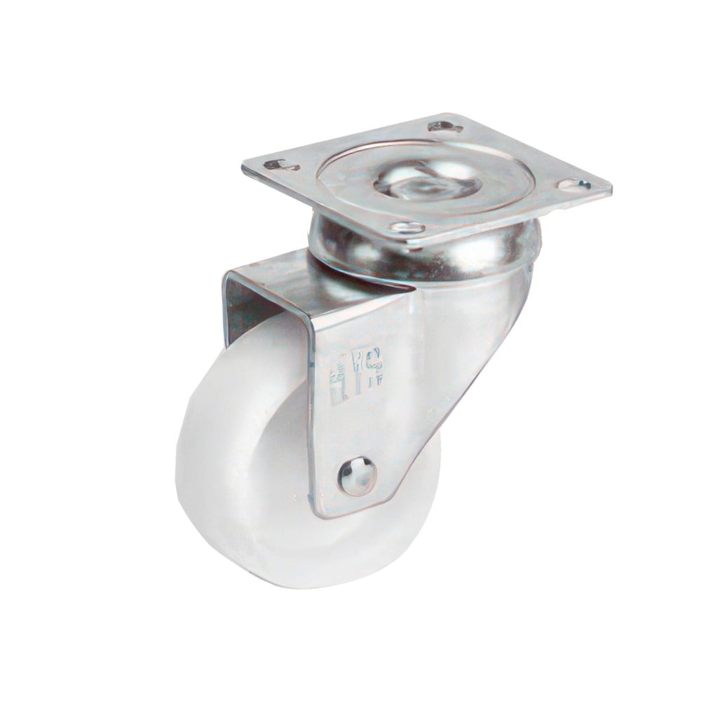 This caster helps move heavy loads on smooth, hard surfaces and finished concrete floors where quiet movement and floor protection are vital. It attaches easily with a plate and 4 screws.