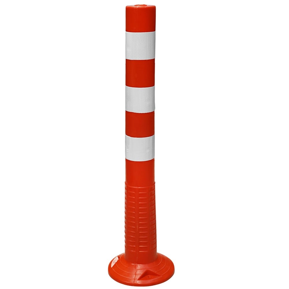 Safety cone with fluorescent strips, produced from an interlaced material to be resistant and elastic at the same time. This product is suitable for limiting the movement of vehicles or people in certain areas. It can be used in parking lots, yards or near other buildings.