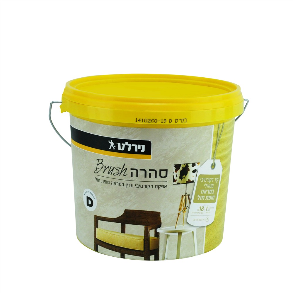 Textured sanded decorative material with metallic finish. Description: Water-based decorative acrylic material with slightly textured metallic effect. Creates after drying a granulated pleasant to touch finish with a game of light and shade. Sahara Brush is applied in 1 coat, is extremely easy to apply and allows even an experiences user to completely redecorate the appearance of the surface. Surface preparation: Clean the surface well from dirt, dust and infirmly attached existing paint. Paint the surface in an acrylic paint in a shade similar to the desired colour of Sahara Brush and await its drying (2-3 hours). Application: Stir the material well before use. Apply the material with a wide brush (at least 2.5 inch) in X-shaped or straight movements until obtaining full coverage and a homogenous coat. Spread the texture along the wall according to desired finish. Move periodically away the wall to get a view of the surface from distance. Dilution: No need, the material is ready to use. Cleaning: Clean the hands and tools with water and soap immediately after application. Theoretical coverage: 1 L covers 5-6 sqm. Dry-time: To-touch 1-2 hours, Complete: 24 hours. Colour: tinting in 25 shades according to the colour card of Sahara Brush. Gloss level: Semi-glossy.