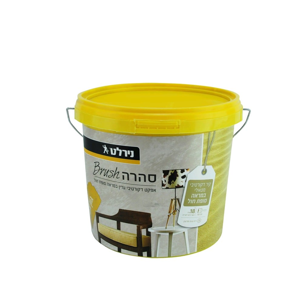 Textured sanded decorative material with metallic finish. Description: Water-based decorative acrylic material with slightly textured metallic effect. Creates after drying a granulated pleasant to touch finish with a game of light and shade. Sahara Brush is applied in 1 coat, is extremely easy to apply and allows even an experiences user to completely redecorate the appearance of the surface. Surface preparation: Clean the surface well from dirt, dust and infirmly attached existing paint. Paint the surface in an acrylic paint in a shade similar to the desired colour of Sahara Brush and await its drying (2-3 hours). Application: Stir the material well before use. Apply the material with a wide brush (at least 2.5 inch) in X-shaped or straight movements until obtaining full coverage and a homogenous coat. Spread the texture along the wall according to desired finish. Move periodically away the wall to get a view of the surface from distance. Dilution: No need, the material is ready to use. Cleaning: Clean the hands and tools with water and soap immediately after application. Theoretical coverage: 1 L covers 5-6 sqm. Dry-time: To-touch 1-2 hours, Complete: 24 hours. Colour: tinting in 25 shades according to the colour card of Sahara Brush. Gloss level: Semi-glossy.