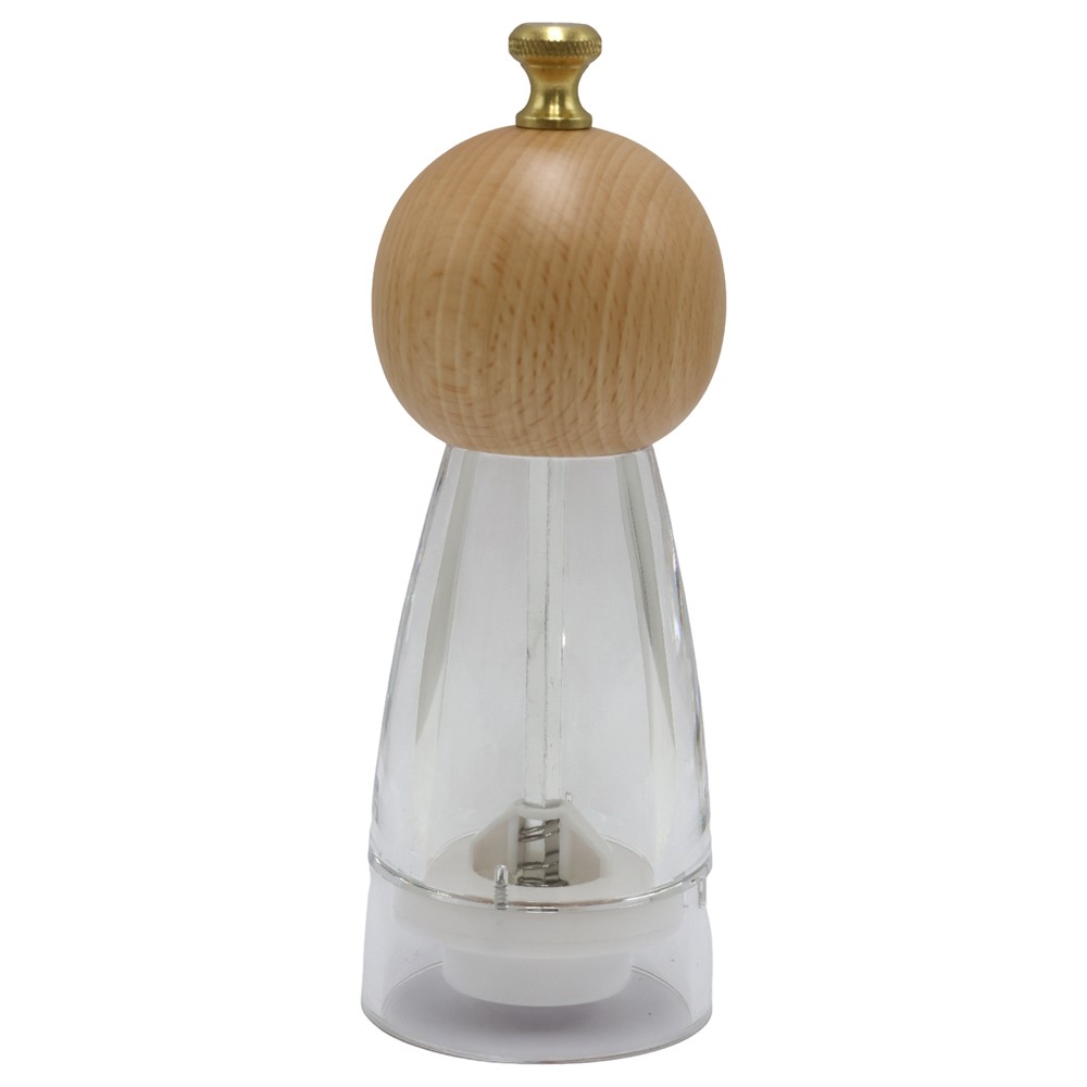 This pepper or salt mill, combined with transparent glass and natural bamboo, brings a clean and modern elegance to your table. With a diameter of 6 cm and a height of 15 cm, it has a shape that is easy to hold and use, while the transparent material allows you to see the contents and their quantity at any time. The bamboo lid with its warm natural color adds an organic and aesthetic touch, making this mill not only functional, but also a decorative element. The grinding mechanism ensures fine and uniform processing, making every meal more aromatic and fresh. Elegant, practical and durable — a small accessory that brings style to any kitchen.