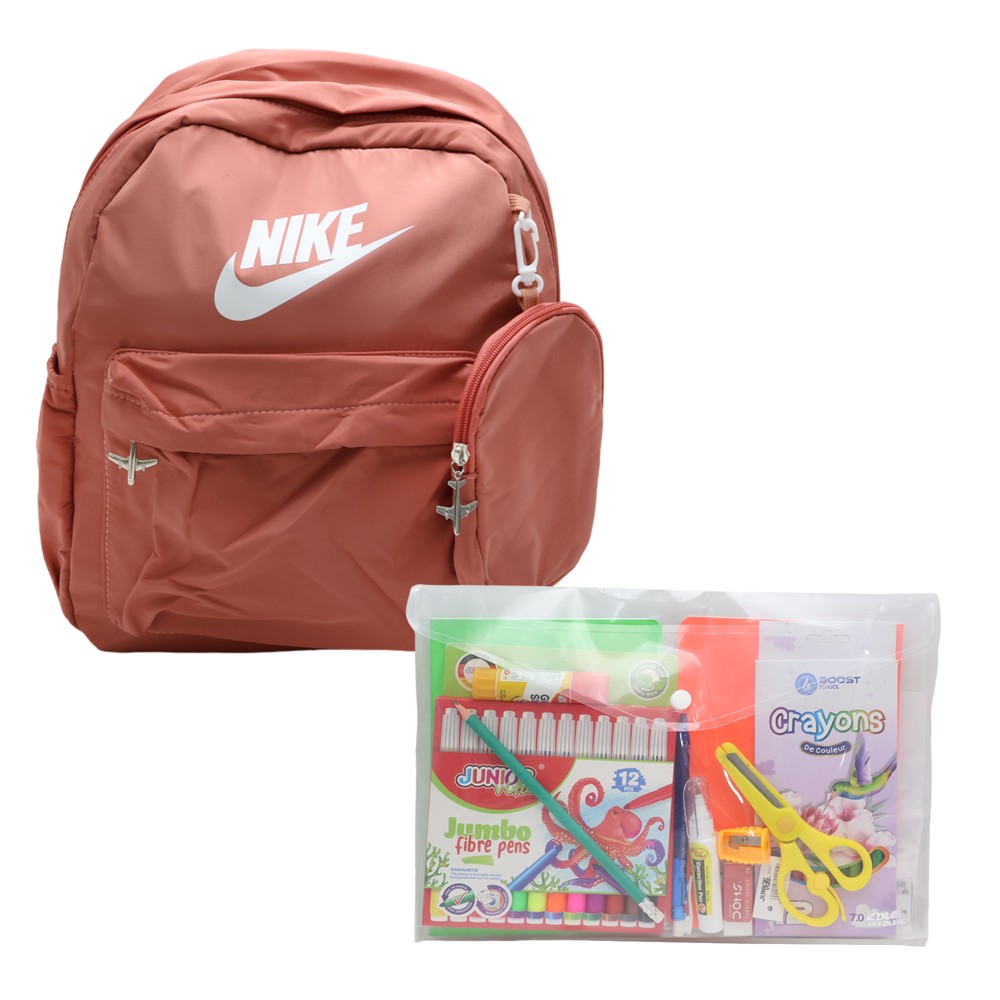 The school bag set for girls contains a practical bag along with necessary school supplies such as 1 pack of wood colors, 1 pack of pencils, 1 pack of rulers, 2 notebooks (1 box + 1 stationery), 1 scissors, 1 eraser , 1 pencil sharpener, 1 corrector, 1 pencil, 1 pen, 1 adhesive.