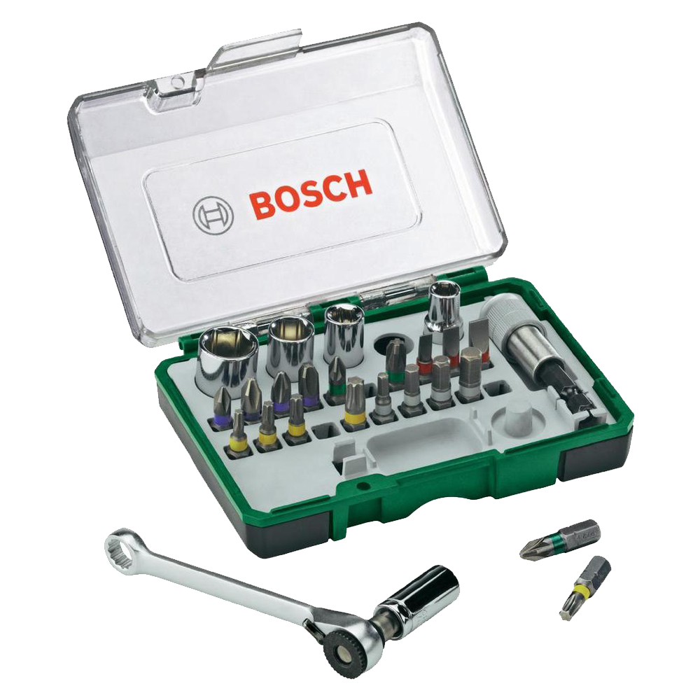 Screw driver bits set 27 pc. The tip of a screwdriver is thermally treated to increase the time of use. Built with special steel and titanium coating is very stable and provides a rapid and efficient screw.The screws used for mounting on surfaces with different materials. Kit Contents: 4 x PH Bits 1/2/2/3, 3 x PZ Bits 1/2/3, 3 x S Bits 4/5/6, 5 x TORX Bits 10/15/20/25/30, 4 x HEX Bits 3/4/5/6, 5 x Sockets 6/7/8/10/13mm, 1 x Socket adapter, 1 x mini ratchet, 1 x universal bit holder.