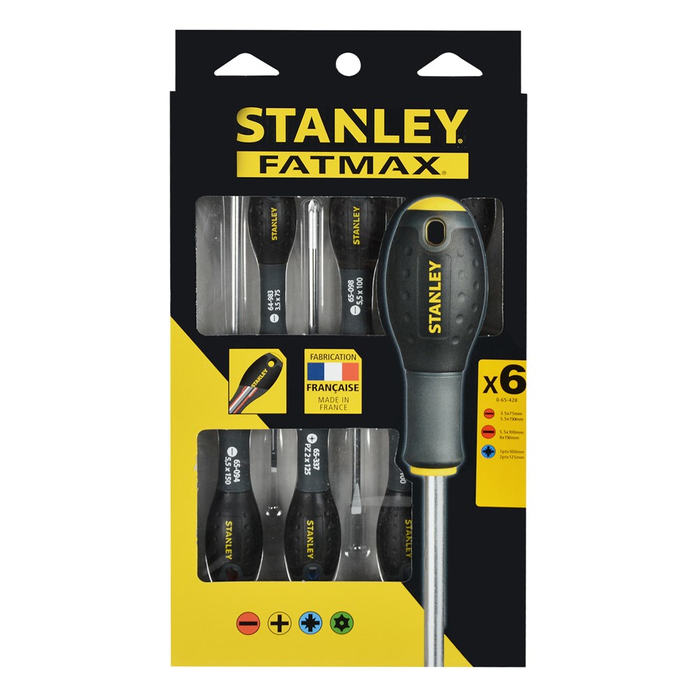 The Stanley FatMax ® Screwdriver sets have a chrome vanadium steel bar allows high torque and reduces the risk of tip breakage and the handle is moulded directly to shaft for a virtually unbreakable bond - gives long life and durability The soft-grip handle gives a perfect combination of great grip and reduced fatigue in use and is colour coded for easy identification of the right tip type for the application The smooth domed end offers fast, comfortable spinning action and the large diameter handle offers higher torque when driving wood screws Parallel Tip: 3.5mm x 75mm, 5.5mm x 75mm Flared Tip- 5.5mm x 100mm, 8mm x 150mm Pozi Tip- PZ11 x 100mm, PZ2 x 125mm