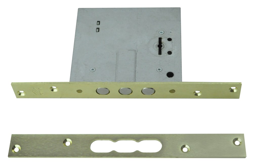 Cylinder mortice locks with multiple dead-bolt Technical features: • Painted brass plated satin steel faceplate and striking plate • Zinc plated steel case • Flat, reversible, nickel-plated latch • Nickel-plated steel bolt