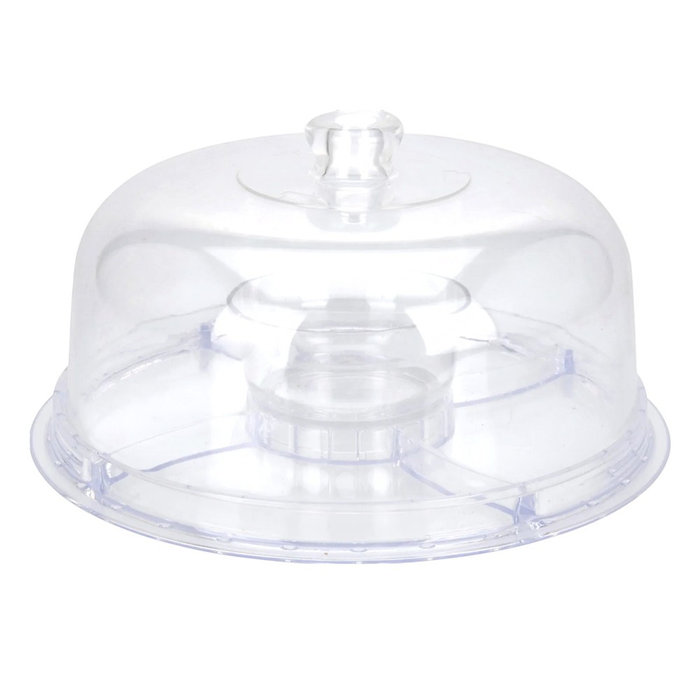 Transparent polystyrene serving tray with a diameter of 30.5 cm and a height of 20 cm, divided into 6 separate sections, is ideal for serving various foods in a practical and organized way. The lightweight and durable material makes this tray suitable for use at family parties or various events. The transparent color gives it an elegant and modern look, making it easy to identify the foods in each compartment.