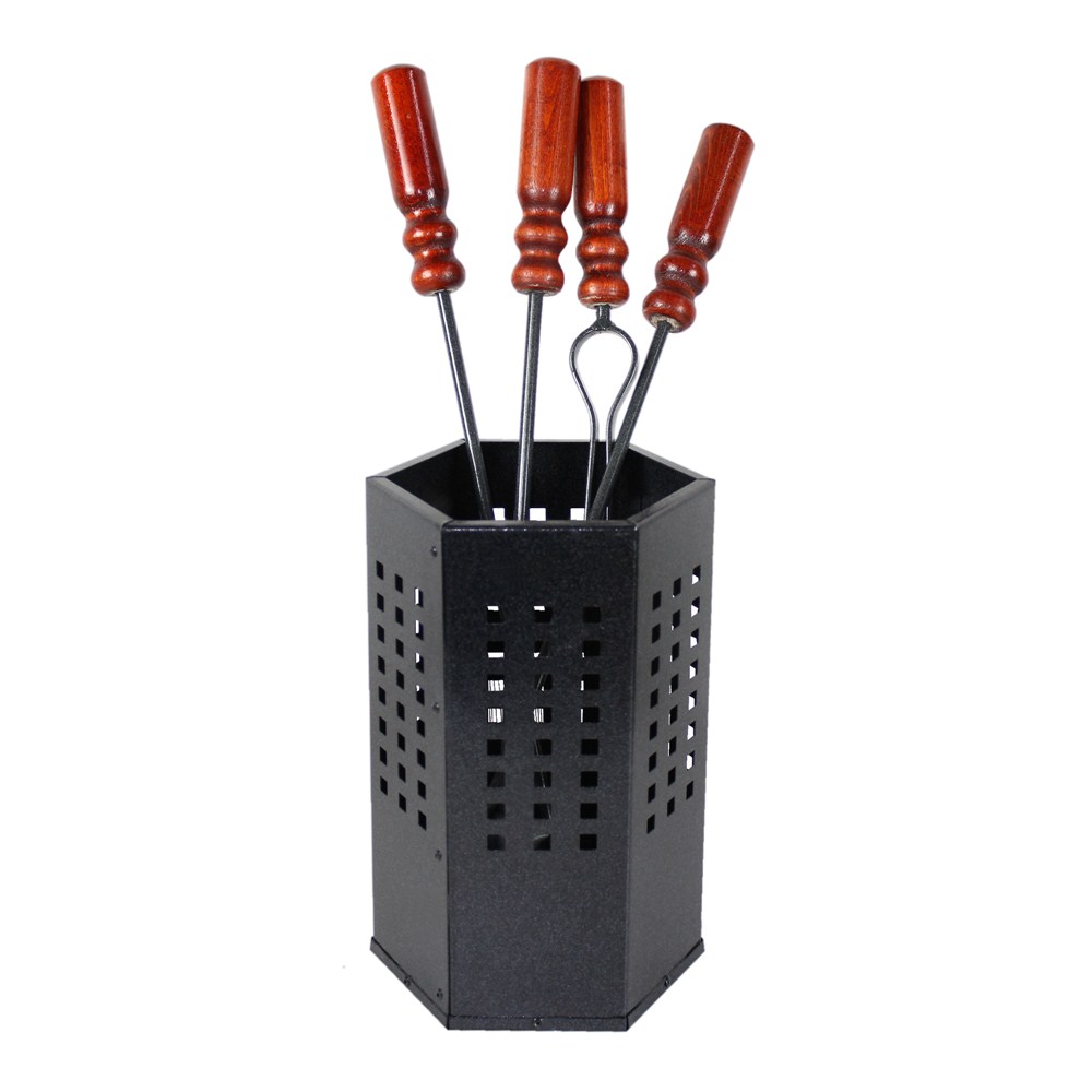 Set composto da 4 utensili manici in legno più contenitore, in ferro battuto verniciato a polvere. Dimensione cm. 18xH5
