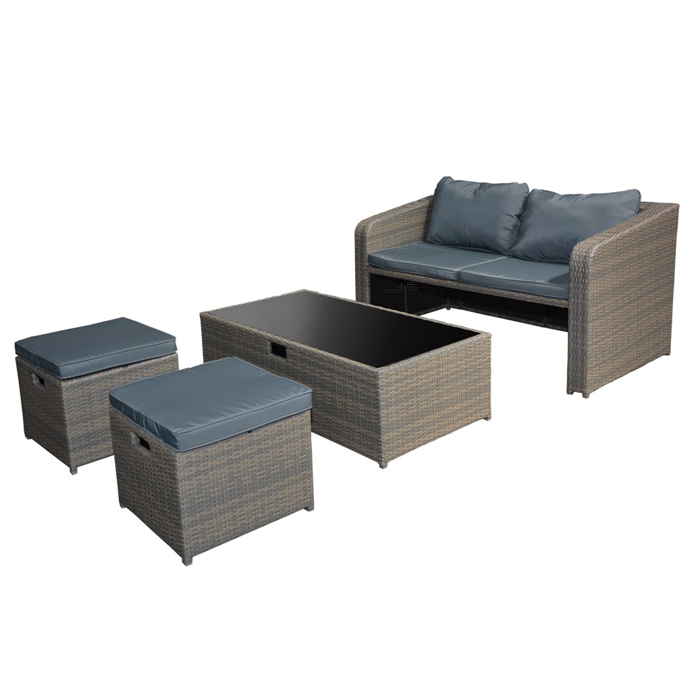 The SICILIA set with interweaving and beautiful cappuccino and gray colors will give your living space and is very convenient for the furnishing of your outdoor restaurant or bar facilities. Aluminum structure makes it easier to move them. It comes in handy. a 136x76x75cm armchair, two Ottomans 45x45x35cm with polypropylene and aluminum material, and a 61x51x82cm glass-sized table. It also includes polyester pads that make your living room more comfortable.