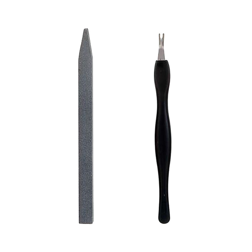 Cuticle trimmer set, which contains the nail file and the cuticle pusher, with resistable stainless steel material, in silver and black color. It can be used for cutting and smoothing the nails, trimming and pushing the cuticles and cleaning the dead skin. This product is small and easily portable.