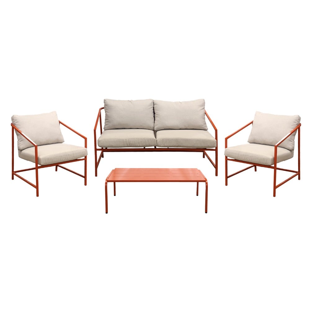 You're reviewing:Set of 2 chairs + 1 armchair + 1 side table, metal, orange, chairs 64x64xH68 cm / armchair 132x64xH68 cm / table 100x50xH36 cm