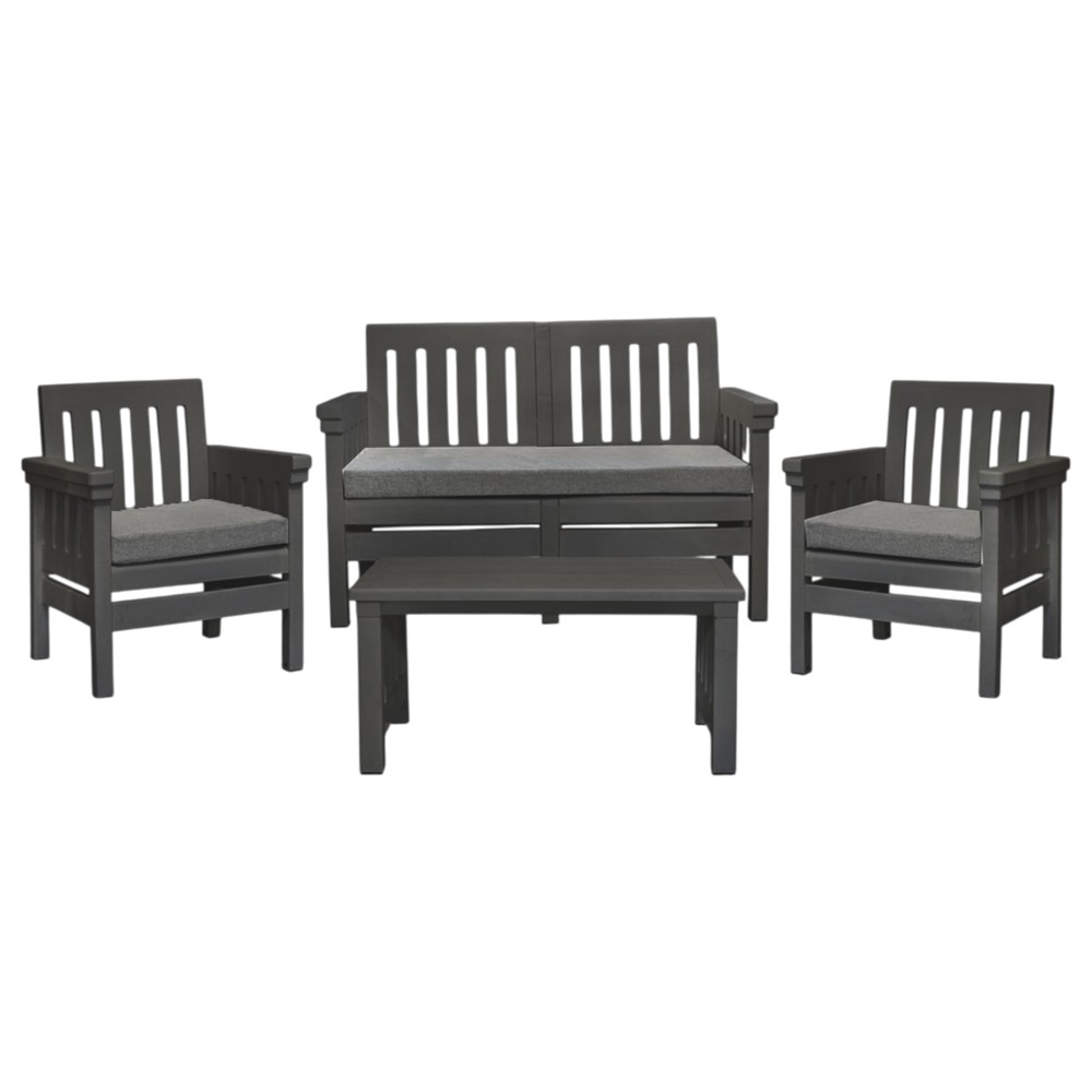 Set of 2 single armchairs with cushions + 1 double armchair with cushions + 1 coffee table, plastic rattan, anthracite structure, grey cushions, single 56x64xH89 cm / double 56x118xH89 cm / table 48x85xH42 cm