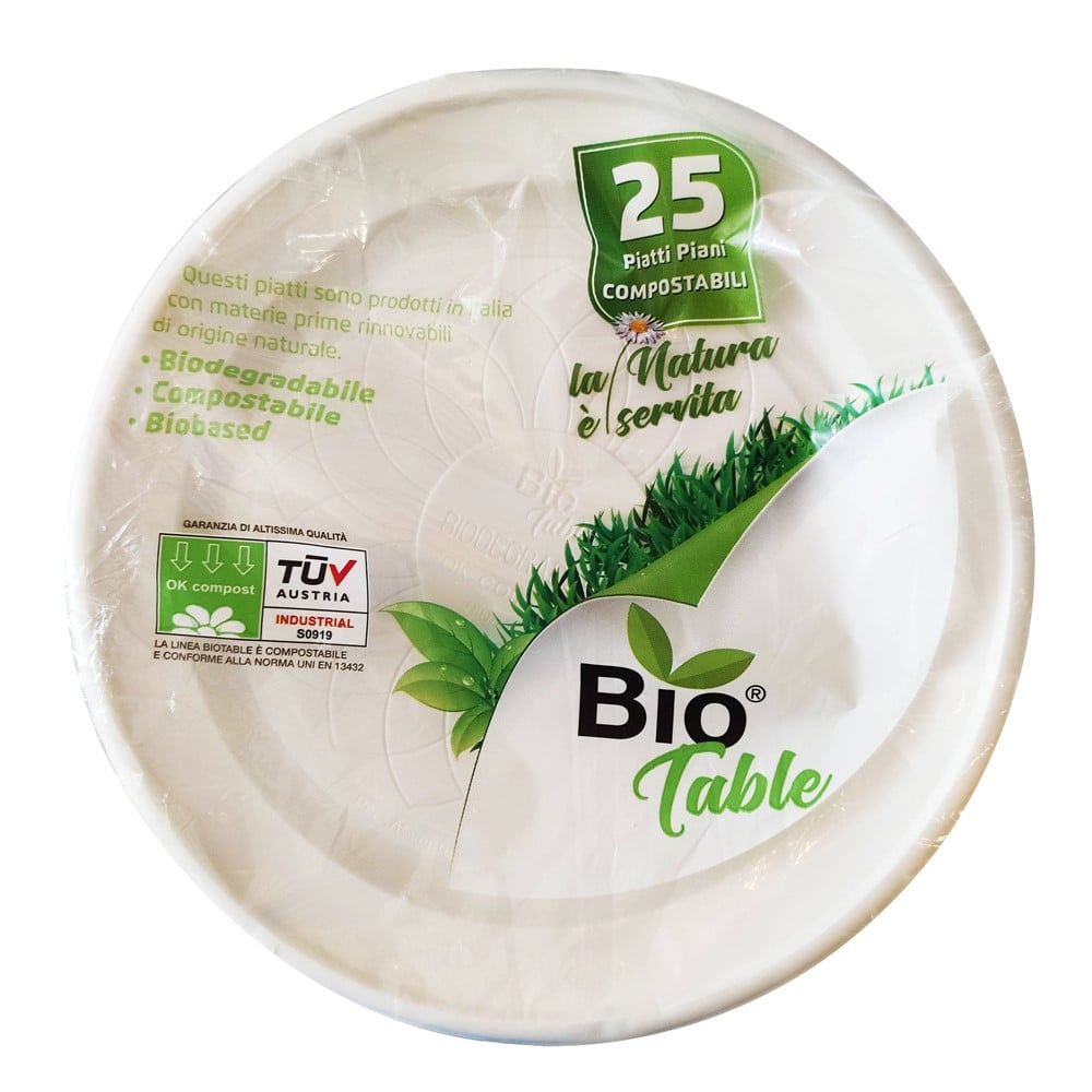 Disposable shallow plate, made of biopolymer material, with a diameter of 22 cm, in white color. The component material is biologically degradable, has no toxic or harmful content and is hygienic to use. It is used to serve different foods. The package contains 25 plates.