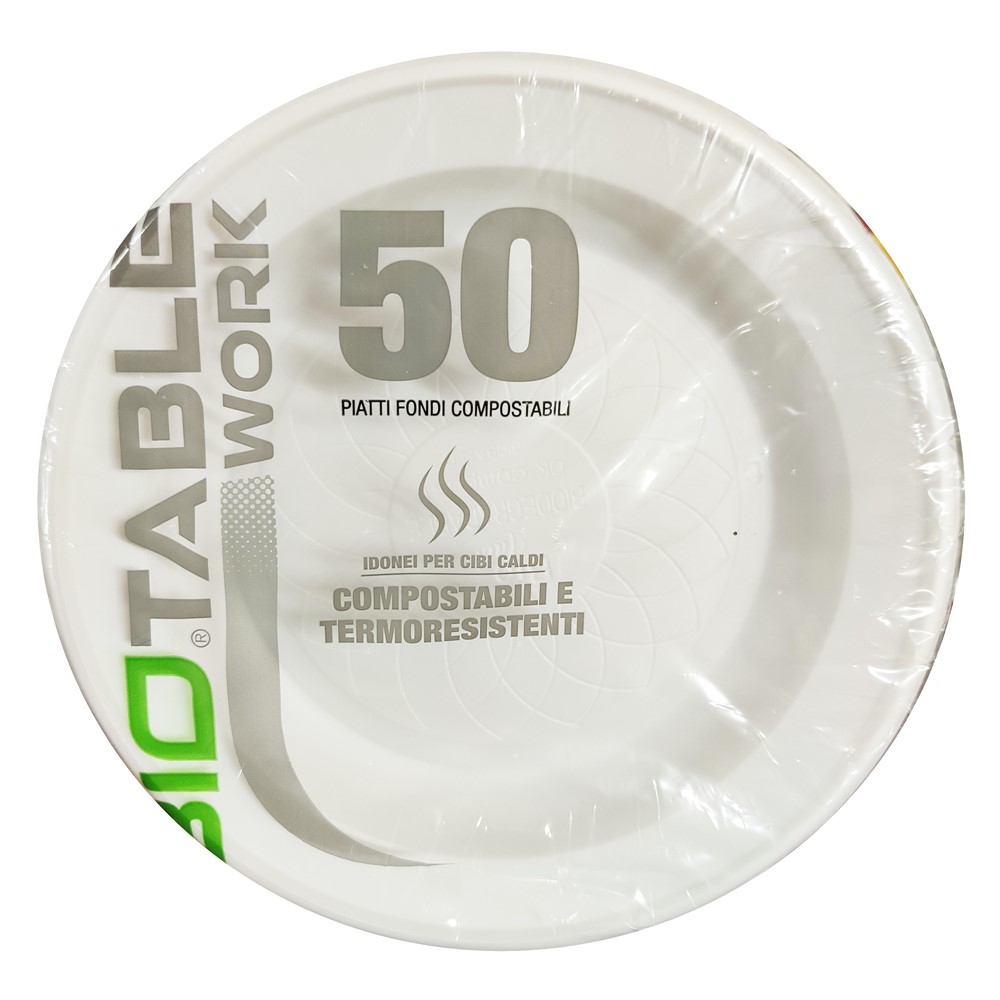 Disposable deep plate, made of biopolymer material, with a diameter of 22 cm, in white color. The component material is biologically degradable, has no toxic or harmful content and is hygienic to use. It is used to serve different foods. The package contains 50 plates.