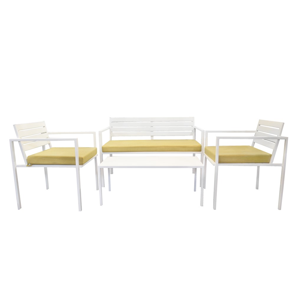 The white aluminum set comes with a simple modern style. The all-aluminum construction makes this set very lightweight as well as very durable. Thanks to the anti-corrosion properties of aluminum this set is not corroded by atmospheric agents. Care must be taken with the paint. easily washed. Also suggested for houses on the coast. It should not be left in the rain for a long time.