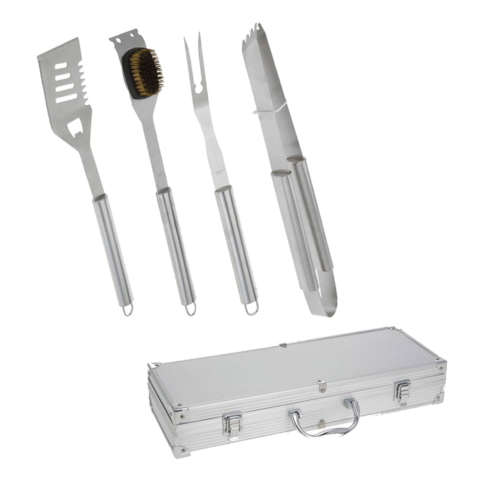 Set of barbecue cooking equipment, made of durable stainless steel material, which includes a fork, a meat tong, a spatula and a cleaning brush. They are used for roasting meat, fish and various vegetables, in barbecues and grills, protecting the hands from high temperatures. This product is easy and practical to use, can be cleaned easily and is suitable for use in barbecues, camping, picnics, etc., as they also have their own storage box.