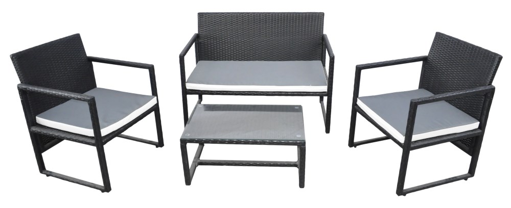 Ratanit set of splice comprising mid tables , two chairs and couch is an ideal choice the furnishing your environment open bars , verandas , terraces , balconies , etc. . The material component of polyethylene ( PE ) is easy and resistant to atmospheric agents making this set very convenient and premises and homes near beaches . Their geometric shapes square of the component parts of this set as the support element , curbs, suprinës the element table and table legs and arms of chairs and sofa with square profile of them bring a modern spirit to your garden . The black color of this set fits easily with all the nuances of color and quite well with the green environment by creating harmonious colors suitability of this set and green environment as well as an inviting and relaxing scenery .