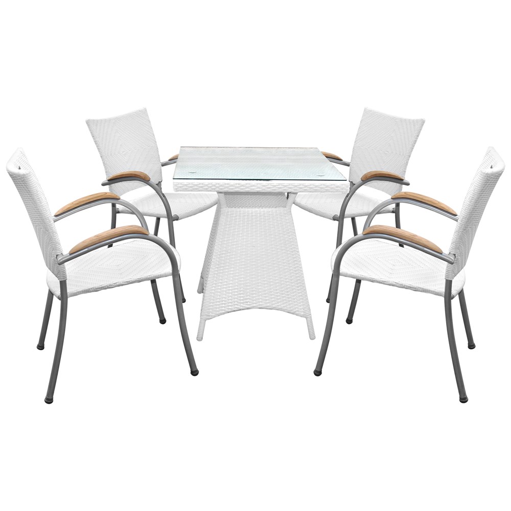 This rattan set consisting of tables with four chairs is an ideal choice for furnishing the environments open bars , verandas , terraces , balconies , etc. . The material component of polyethylene ( PE ) is light and resistant to atmospheric agents making this set very suitable for environment . The white color of this set , fits with all colorss and quite well with the green environment .