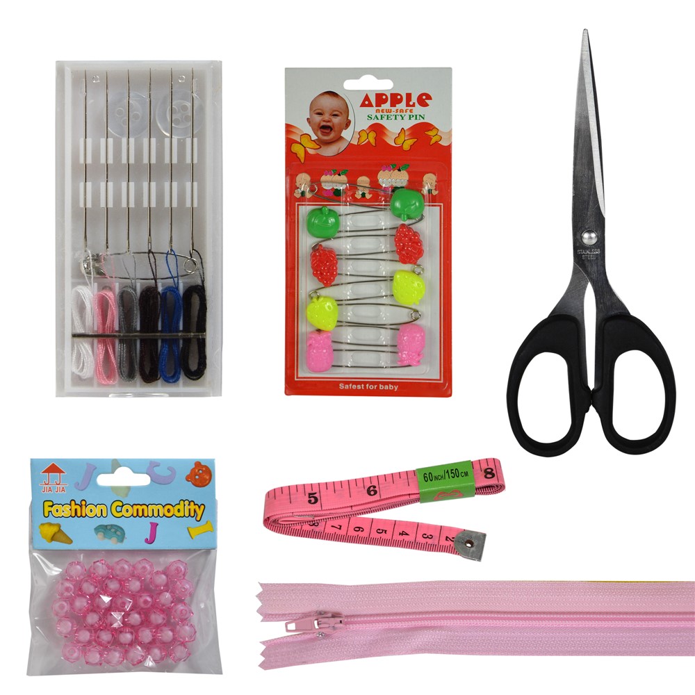 Sewing set contains: 1. Scissors, 16 cm, Silver 2. Thread + needle, 7.5x3.5 cm 3.Meter, 1.5 mt, Miscellaneous 4.Sewing chain, PK6 5.Beads, 0.8 cm, Various 6. Paramanda, 6cm, Plastic + iro