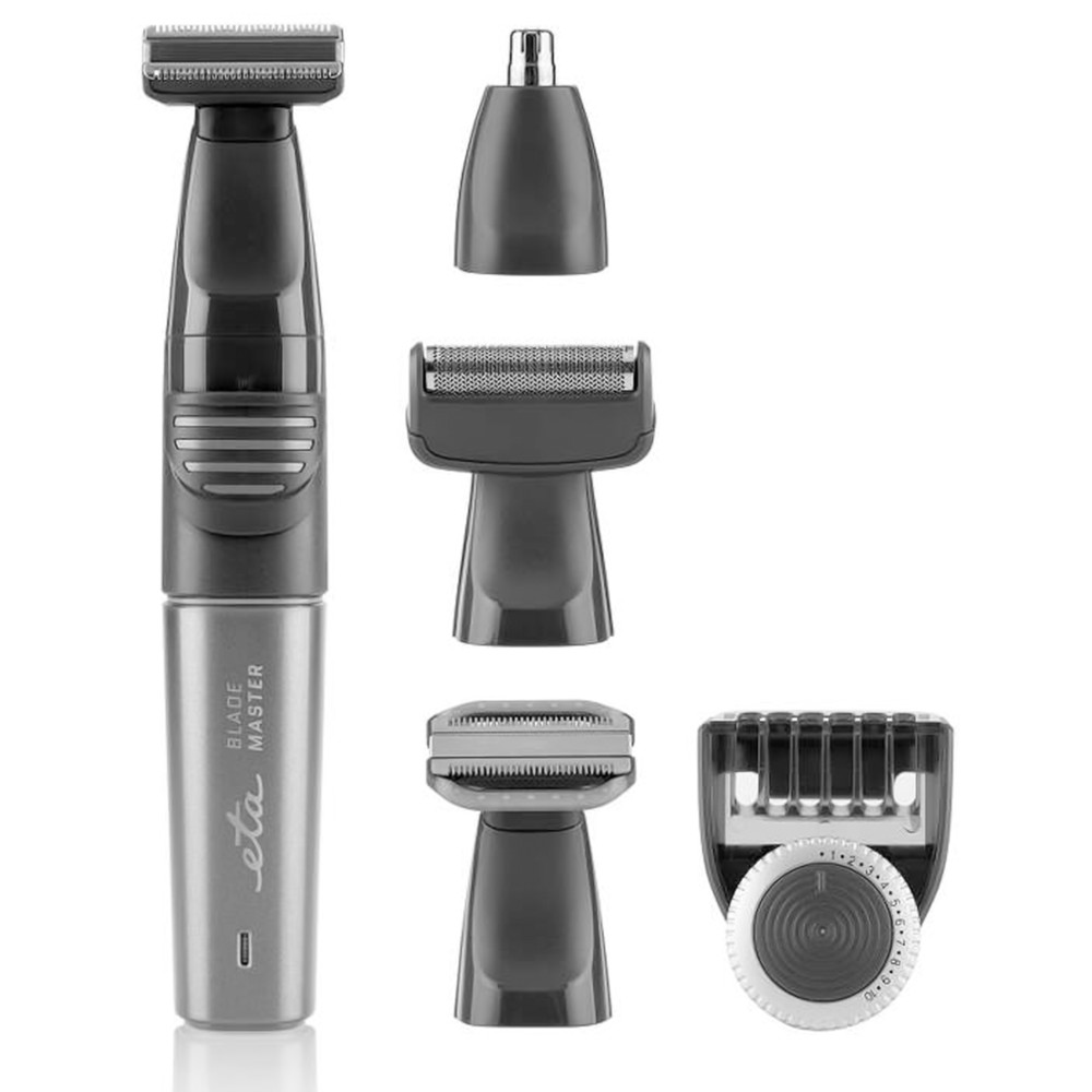 5-in-1 multifunctional trimmer for trimming beards, hair, body, ear and nose hair. Operation on a 3.2V Li-ion battery with an operating time of up to 60 minutes. Do you want a smooth shave but want to avoid razor irritation? The ETA Blade Master multifunctional trimmer exceeds your expectations. Thanks to several replaceable attachments and sharp stainless steel blades, you can use it to shave and trim beards, trim hair, body hair, and trim nose and ear hair. Simply 5 in 1. Whether you're a fan of a clean-shaven face or a stylish stubble, the ETA Blade Master will make beard grooming a breeze. It perfectly adapts to all shapes and you can easily trim your grown beard, but also easily shave off three-day stubble. Just choose one of the practical attachments and it will be done in a few minutes! rritated skin from shaving is not pleasant for any of us. With the special attachment for shaving the whole body, you can achieve a smooth shave without irritation. However, the biting issue can also come after shaving and very often appears in the armpits. After shaving, try to avoid balms containing alcohol and postpone the use of deodorant for a few minutes. In addition to the armpits, you can use the trimmer on the entire body. It can handle a precise shave both on the chest and abdomen, as well as in intimate areas. The operating time is up to 60 minutes, which is enough time even for more demanding adjustments. You can now enjoy a hair salon-like haircut in the comfort of your home. You can use the ETA Blade Master with or without the hair comb attachment. On the extension, you can set the length from 1 to 10 mm, in steps of 0.5 mm. The resulting hairstyle will be exactly according to your imagination. ETA Blade Master also gently handles unsightly nose and ear hair. You should never pull them out with tweezers or wax. A special attachment will take care of their removal effectively and without risk of injury. Best results can be achieved with a dry shave, but if necessary you can rinse it under running water. Changing accessories is quick and easy. In the package you will find 5 different attachments for all parts of the body. Thanks to the 3.2V Li-ion battery, the ETA Blade Master will be in operation for up to 60 minutes and is fully charged in just 2 hours. A light indicator will inform you about the status of charging and operation. Charging takes place smartly via the USB cable included in the package. In addition to the attachments and cable, the package also includes a cleaning brush to help you with maintenance, oil to lubricate the blades and a practical stand in which you can store both the attachments and the machine itself. That way you will have everything nicely together.