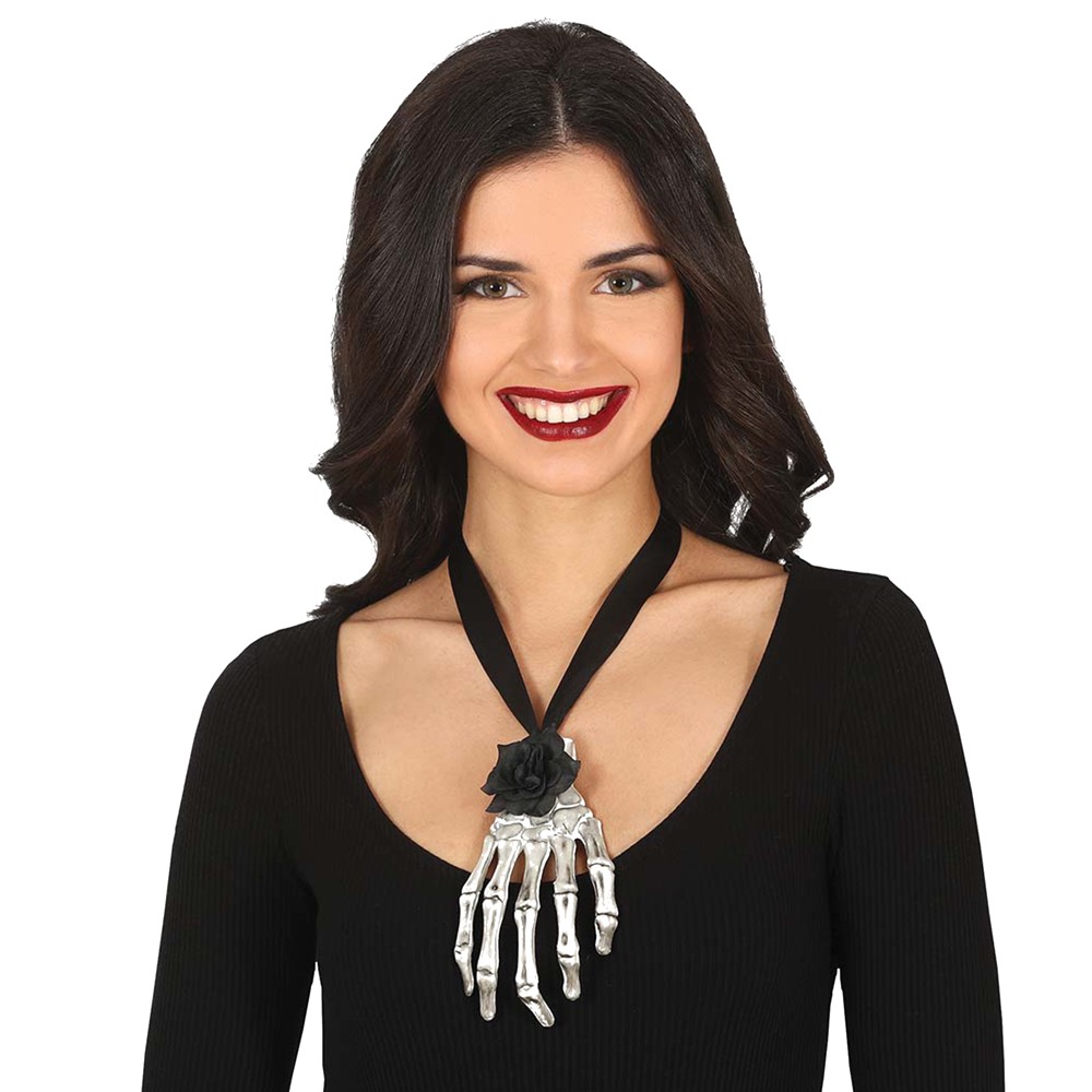 Decorative pendant for Halloween, in skeleton design. The pendant has a skeleton hand and a black flower. Ideal for having an impressive Halloween themed look.
