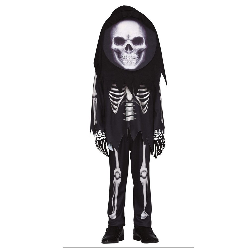 Skeleton costume for children, made of polyester material, in black and white colors. The component material is soft to the touch and does not cause skin irritation. This product is suitable for use by children aged 10-12 years old, from 146 cm tall up to 152 cm tall. The costume includes the jumpsuit and the big-headed skeleton headpiece.
