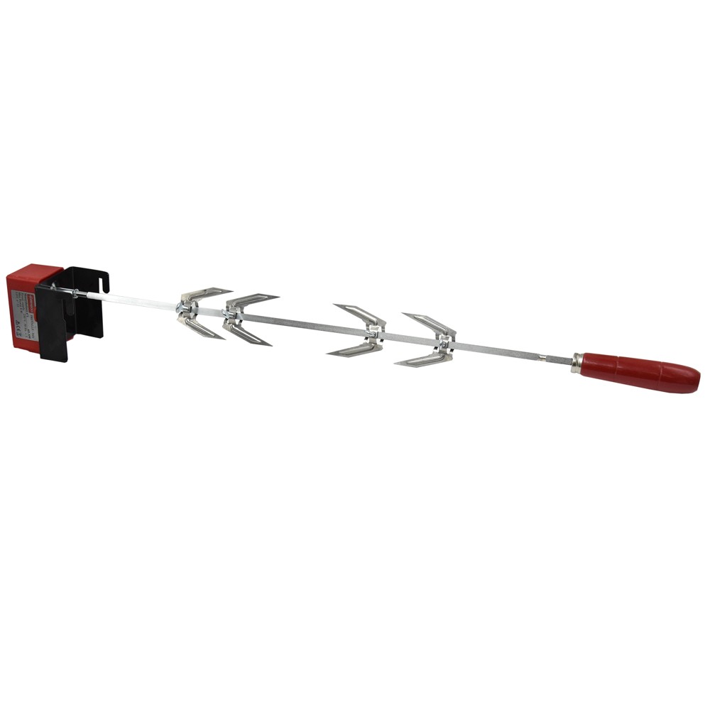 Barbecue skewer, made of stainless steel material, size 58 cm. It is used to roast chicken, meat on skewers, poultry, etc. The set consists of the rod and the electric motor.