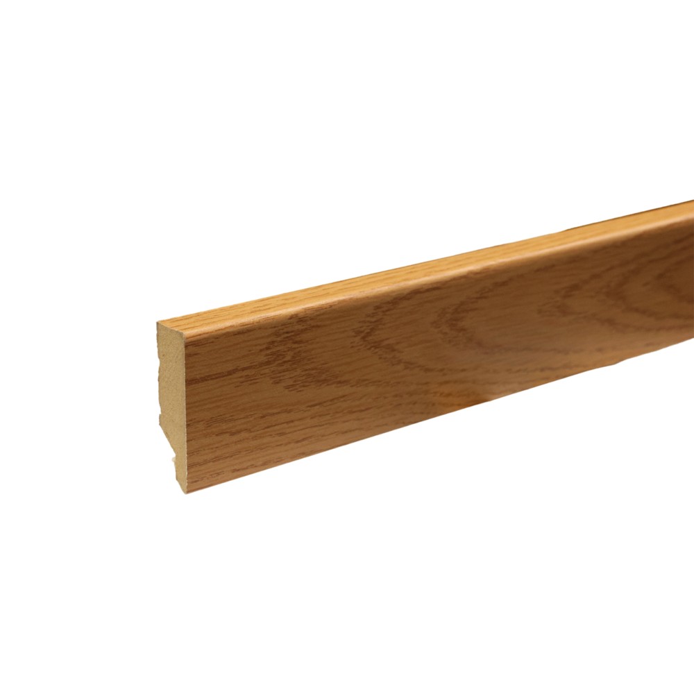 MDF skirting board perfectly covers the expansion joint of the floor. It is covered with wood-patterned foil and is secured with the mounting parts provided. Matching corners and edgings, skirting boards available.
