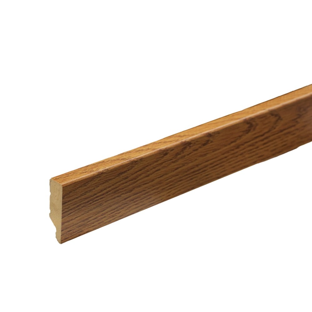 MDF skirting board perfectly covers the expansion joint of the floor. It is covered with wood-patterned foil and is secured with the mounting parts provided. Matching corners and edgings, skirting boards available.