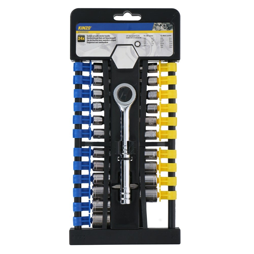 This 24-piece socket set with ratchet handle is made of steel. This Kinzo set of hand tools is ideal for the do-it-yourselfer. The set contains an extensive range of all popular sizes of socket wrenches, a double-sided screwdriver bit and a ratchet handle.
