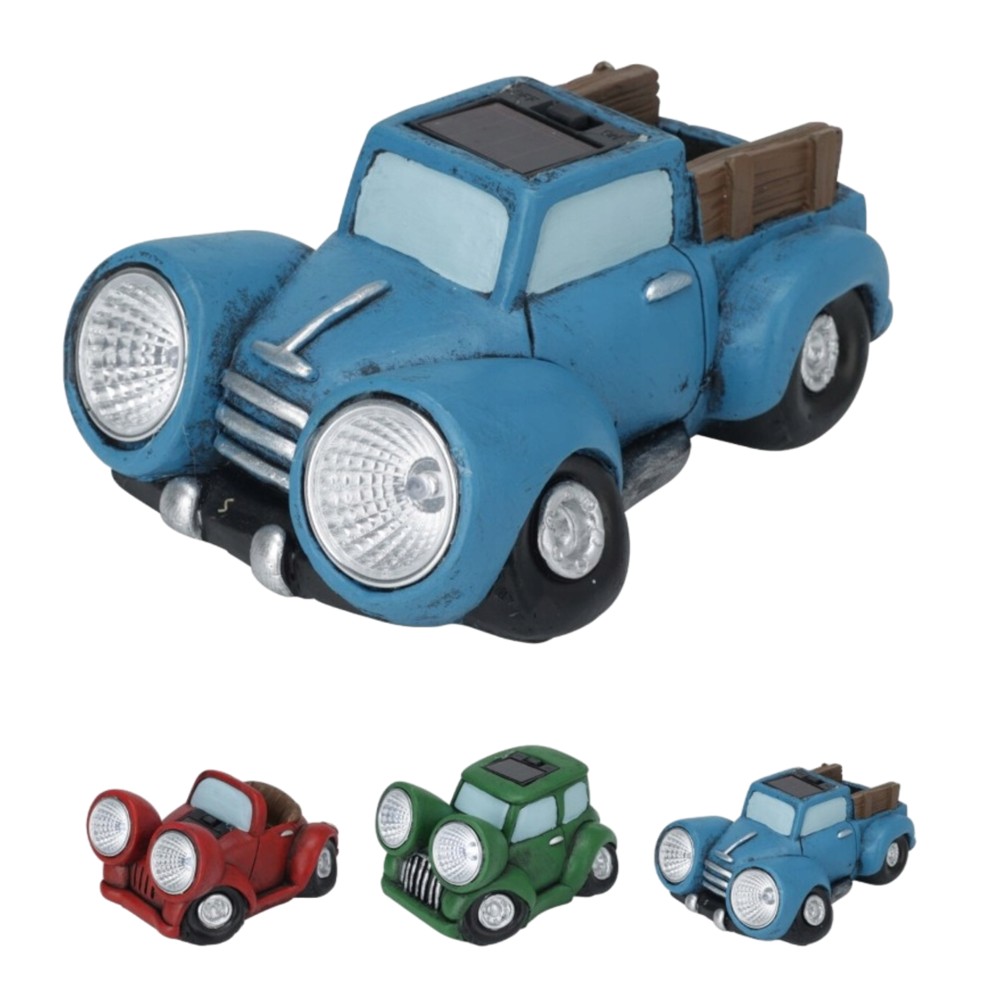 You can find solar panel lights in the shape of a car in different colors such as red, blue or green.