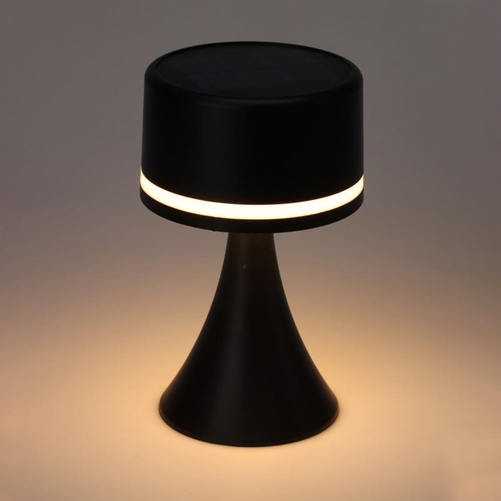 Solar panel table lamp, height 20 cm, black color, plastic material. Solar or USB-C charging, 1200mAh battery. Warm light (2700–3000K) with 3 brightness levels. Practical for indoor and outdoor environments.