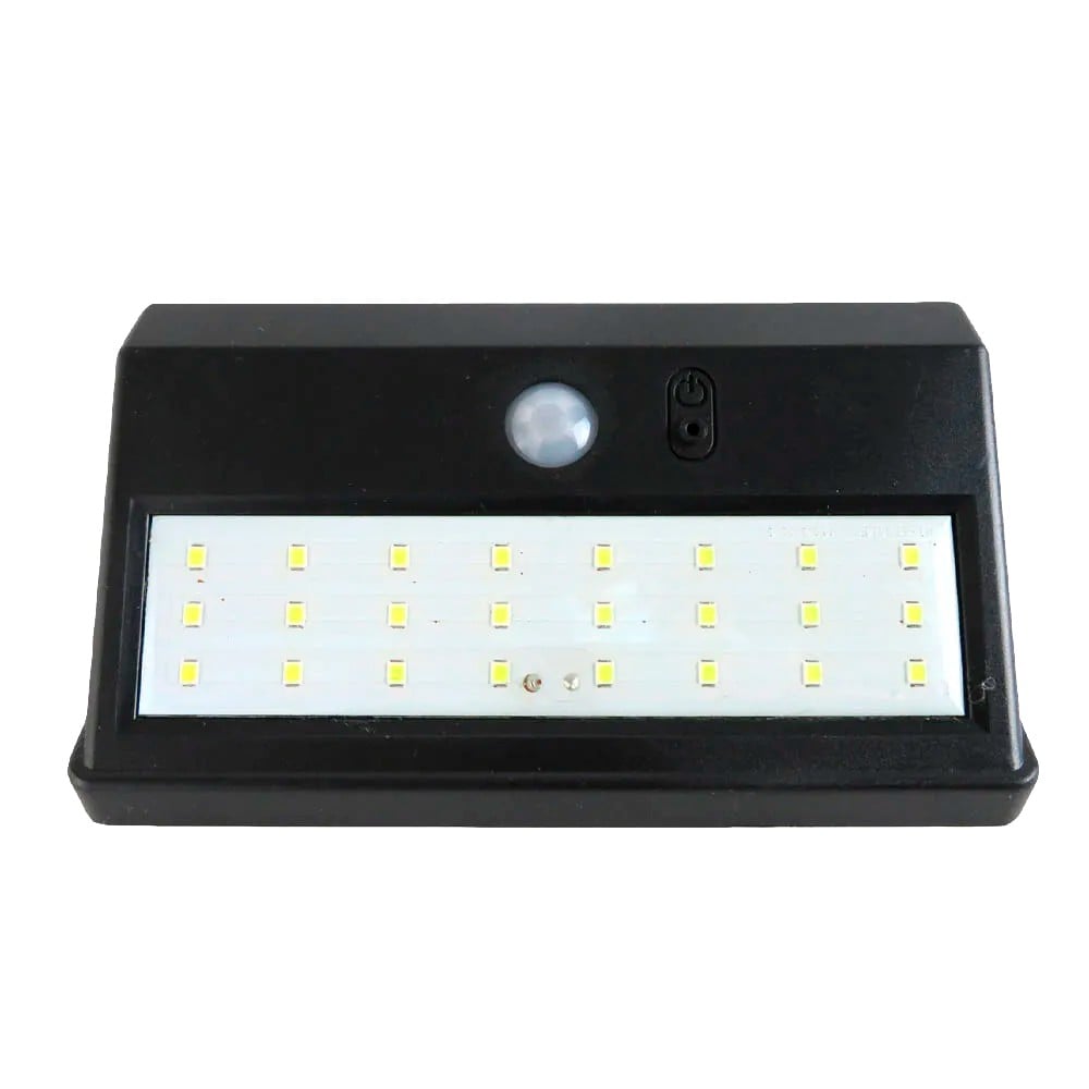 Solar panel wall light, measuring 14 x 11 x 5 cm, with a brightness of 30 lumens and equipped with a sensor. This light is black in color and is automatically activated by a sensor, providing efficient lighting at night. Ideal for outdoor use, such as on garden walls, pillars, or walkways, this light provides renewable energy from the sun and is an excellent solution for safe and sustainable lighting.
