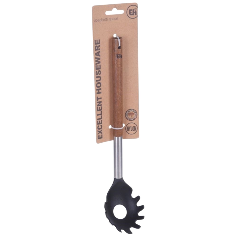 A spaghetti spoon is an indispensable item for every spaghetti lover. It not only makes it easier to put spaghetti on a plate, but also prevents the kitchen from getting dirty. The specially shaped working part equipped with teeth effectively protects the pasta from sliding off. The spoon is made of durable , damage resistant and high temperature resistant materials like nylon and acacia wood combined with stainless steel at the handle part. It can be used for all types of cookware, including those with a delicate non-stick coating, because it does not scratch the surface. The hole in the upper part of the handle allows for convenient hanging, so you can always have it at hand, and at the same time save space in the kitchen drawer.