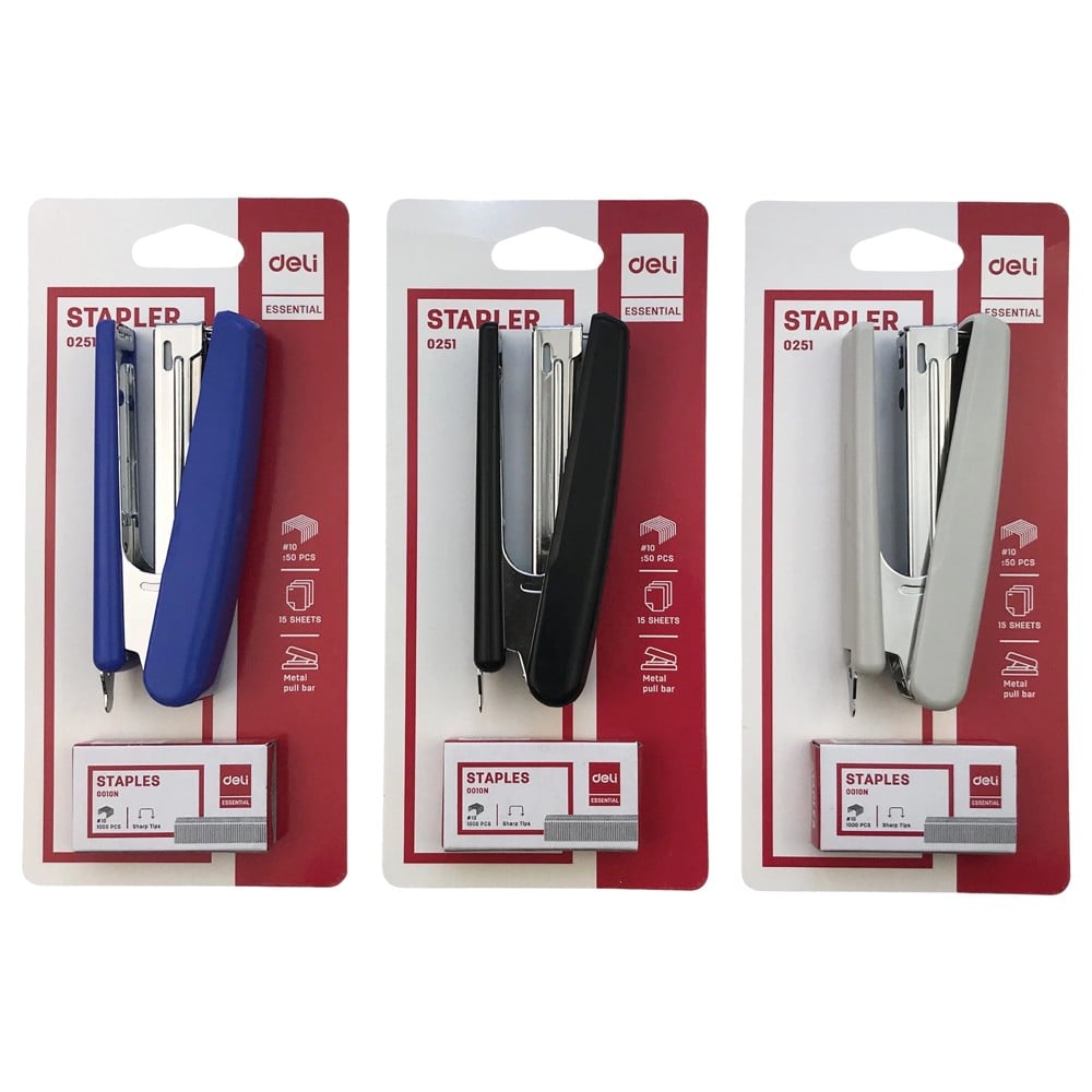 Deli stapler and wire, no. 10. Designed for simple and efficient use, this stapler is ideal for binding documents and is equipped with wire no. 10.