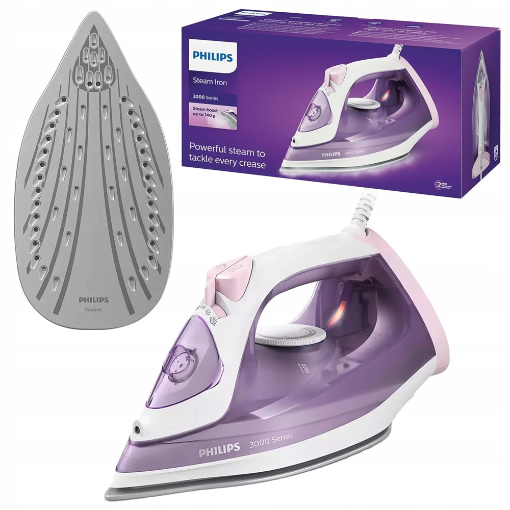 Our steam iron 3000 series makes ironing easy with the powerful steam boost that tackles tough creases.The ceramic soleplate ensures smooth gliding while the 300ml water tank is large enough to finish smaller ironing loads without a refill. Steam boost up to 140 gram for extra power. The strong steam boost gives you that extra power to penetrate deeper into the fabric and cut through the tough creases easily. Continuous steam up to 30 g/min for consistant performance. Strong and consistent steam output to remove creases faster. 2000 watt for fast heat-up. Delivers fast warm-up and powerful performance. Smooth gliding ceramic soleplate. Our durable ceramic soleplate glides well on any ironable garment. It does not stick to your garment, is scratch resistant and easy to keep clean. Our drip stop prevents water dripping on your garment. Our drip-stop system prevents leakage to avoid stains from water droplets, so you can iron with confidence at any temperature. Vertical steaming for hanging fabrics. With the vertical steam function you can refresh garments right on the hanger and remove creases from hanging fabrics such as curtains. No ironing board required. Reach difficult places easily with the triple precision tip. The tip is precise in 3 ways: it has a pointed tip, button groove and sleek nose design. Our triple precision tip helps you handle even the hardest-to-iron spots, like buttons and pleats. Built-in calc-clean slider, long-lasting steam performance. This iron operates with ordinary tap water. Calc-clean is a built-in cleaning function to remove calcium buildup, or limescale, and maintain peak performance. Iron more in one go with the 300ml water tank. Fewer refills are required thanks to a large 300ml water tank. So you can iron more clothes in one go.