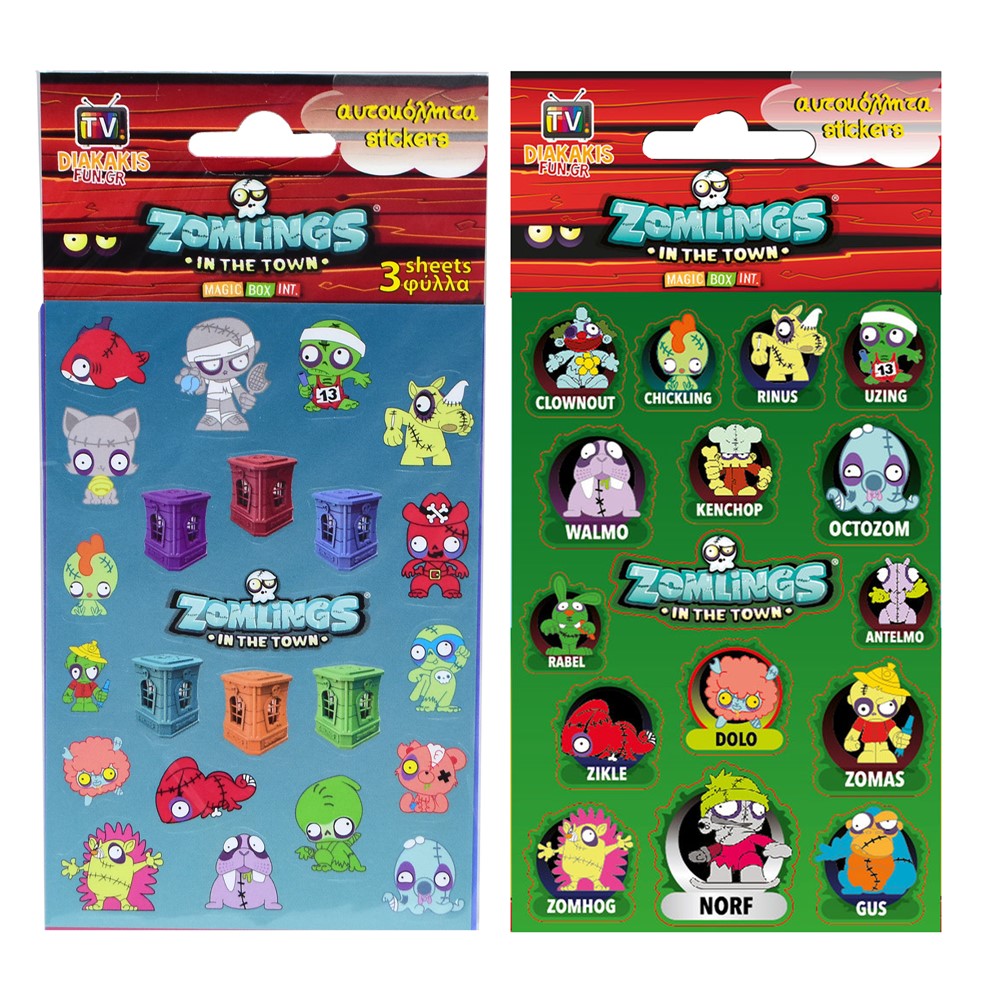 Stickers for kids, with Zomlings in the Town design, made of polyvinyl chloride (PVC) material, in assorted colors. The stickers are used to decorate books, notebooks, letters, postcards, gift boxes, as well as they can be used to decorate children's bedrooms, and can be placed on paper and cardboard surfaces, various furniture, doors, etc.