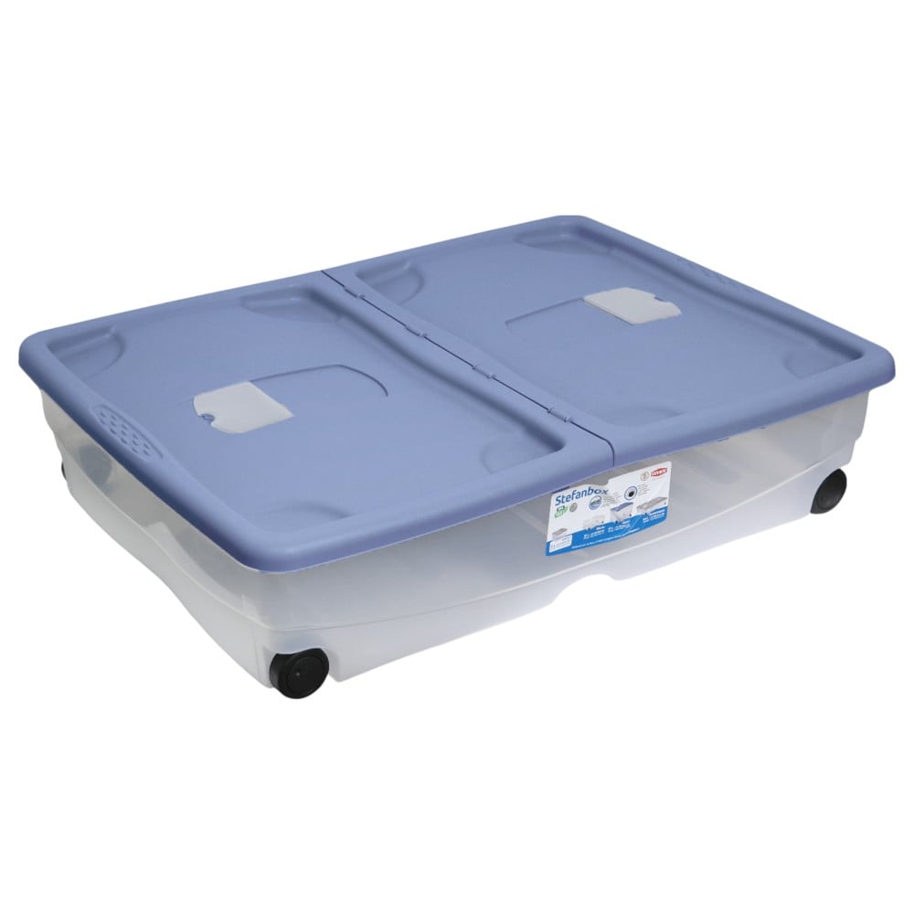 Storage box with wheels, plastic, transparent/ blue, 64 lt, 80x60xH18 cm