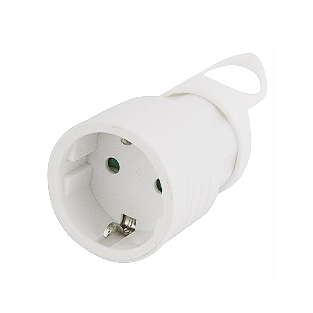 Straight schuko socket, 16A, 2570 W, 250 V, white. This category of sockets has civil use. The outer rubber material makes it resistant.