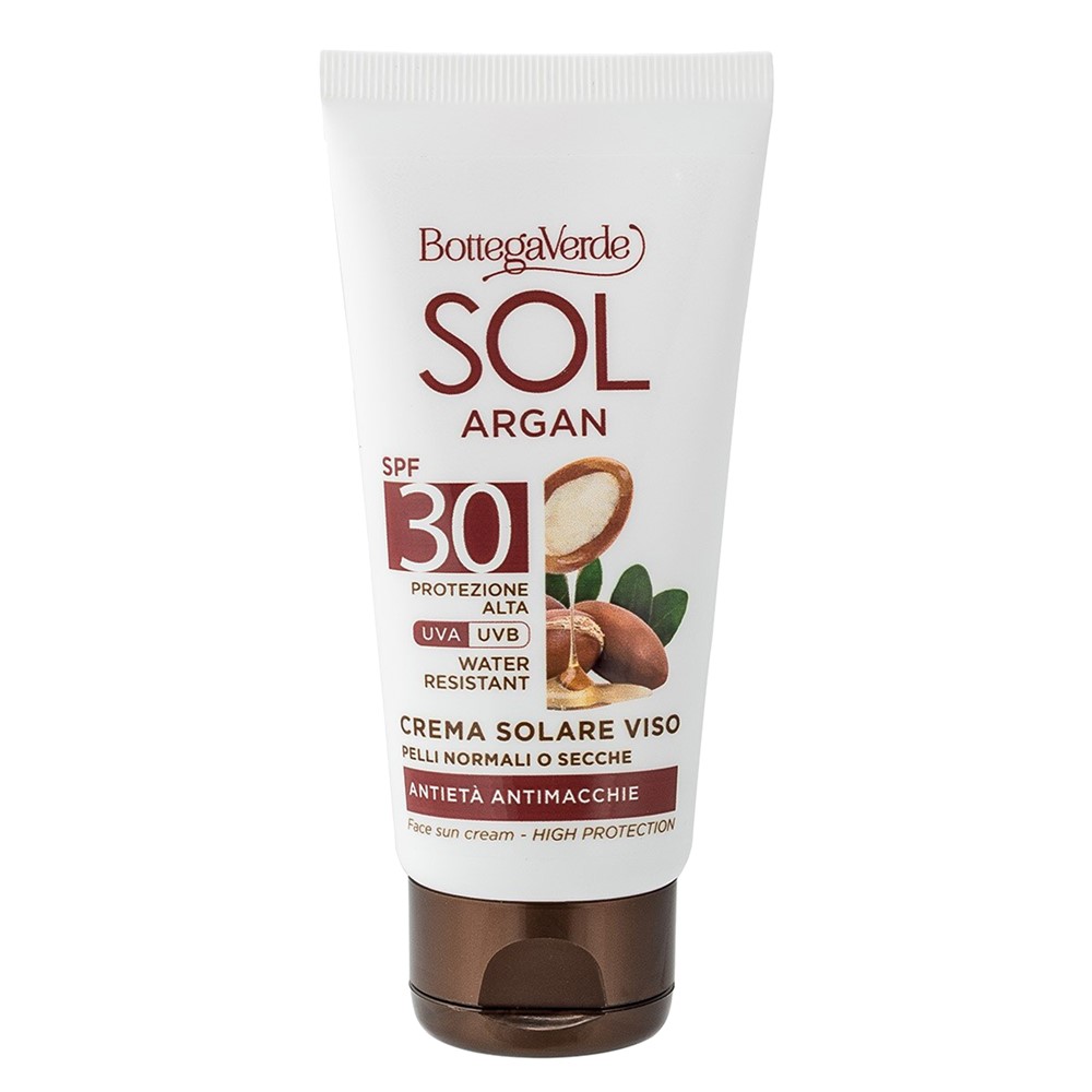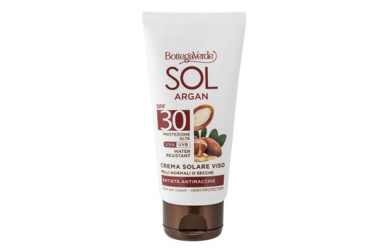 Sun protection face cream, with a dermatologically tested formula, which helps protect the skin from sunburn and prevents the signs of aging caused by the damaging effects of UVB and UVA rays. The cream has a sun protection factor of 30 SPF for an effective skin protection and contains argan oil with a nourishing effect on the skin. How to use: Apply evenly before sun exposure and wait for it to be absorbed by the skin. Repeat the application regularly, to maintain protection, especially after you have bathed in the sea, after you have dried with a towel and in case you have sweated. Avoid contact with eyes.