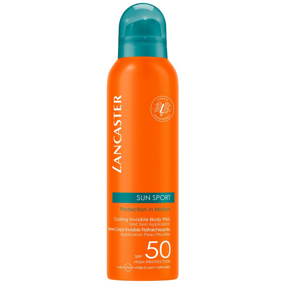 Lancaster Sun Sport Cooling Invisible Body Mist SPF50 200ml is a high sun protection for the body, sweat and water resistant. Provides broad-spectrum protection with an immediate cooling effect. Skin-friendly, it targets 100% of the sun's spectrum and also helps repair sun-damaged skin. Very easy and quick to apply, its transparent and light formula allows the skin to breathe even during intense sports activities.