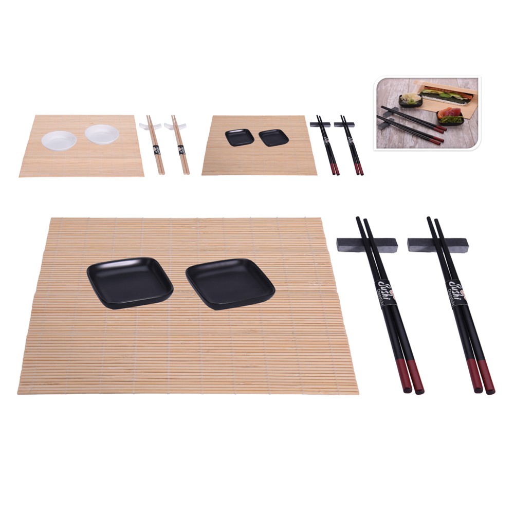 Set suitable for serving sushi, for 2 people. The set includes everything from the flat plate, chopsticks, chopstick holder and serving plate.